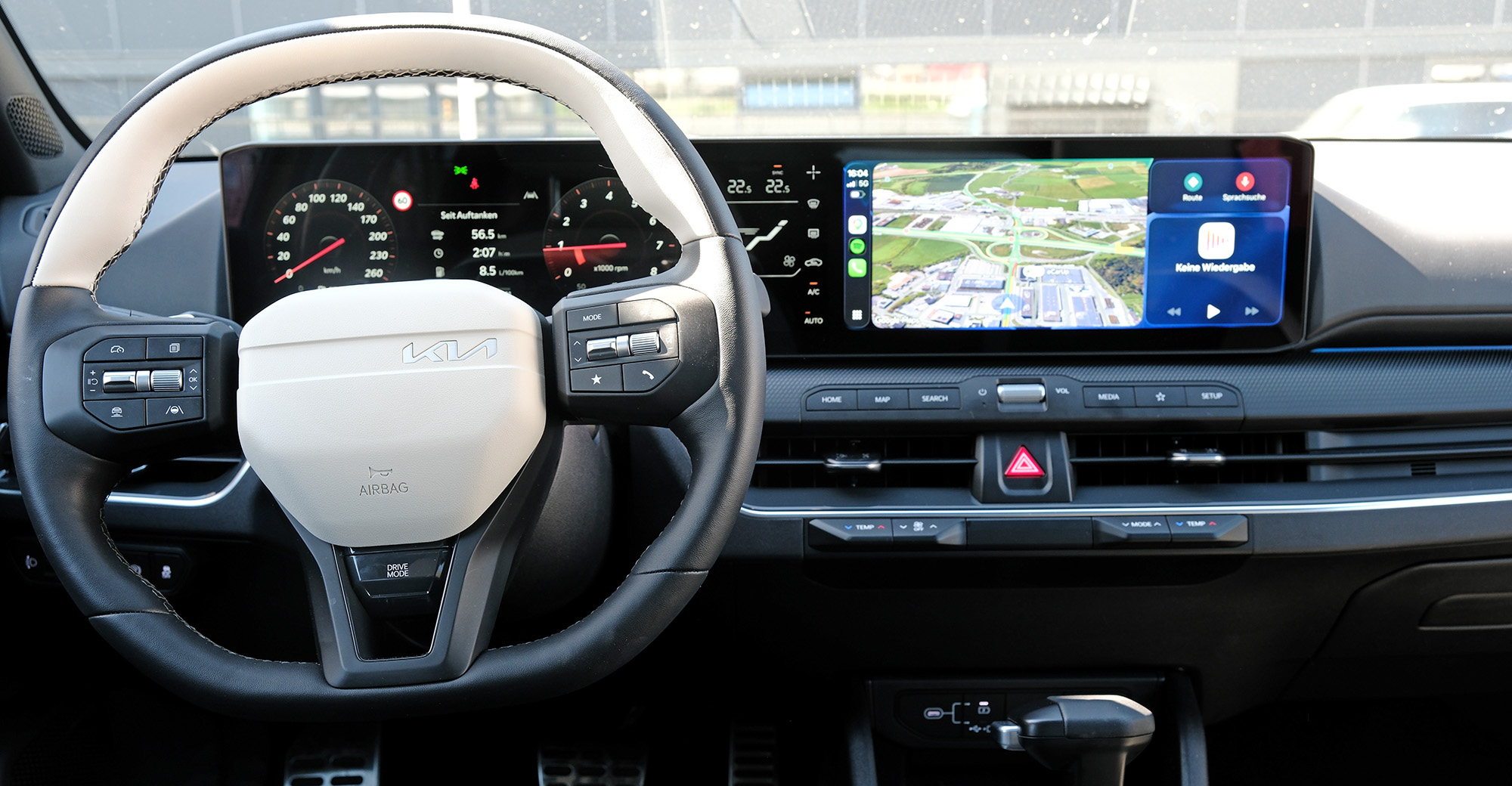 Nach diversen SUV-Testwagen überrascht mich die tiefe Sitzposition im Kompakten zunächst. Doch wie man es von Kia kennt, ist hier alles an seinem Ort. Keine Touchexperimente, keine Suchspiele, so mag man das. Nur über das kleine Klimadisplay zwischen Tacho und Hauptbildschirm kann man sich streiten. Doch die wesentlichsten Dinge (Temperatur seitengetrennt, Lüftertempo) lassen sich per Tasten regulieren. Hier gibt es sogar noch einen fast schon archaisch wirkenden Wählhebel. Ich stelle ihn auf D.