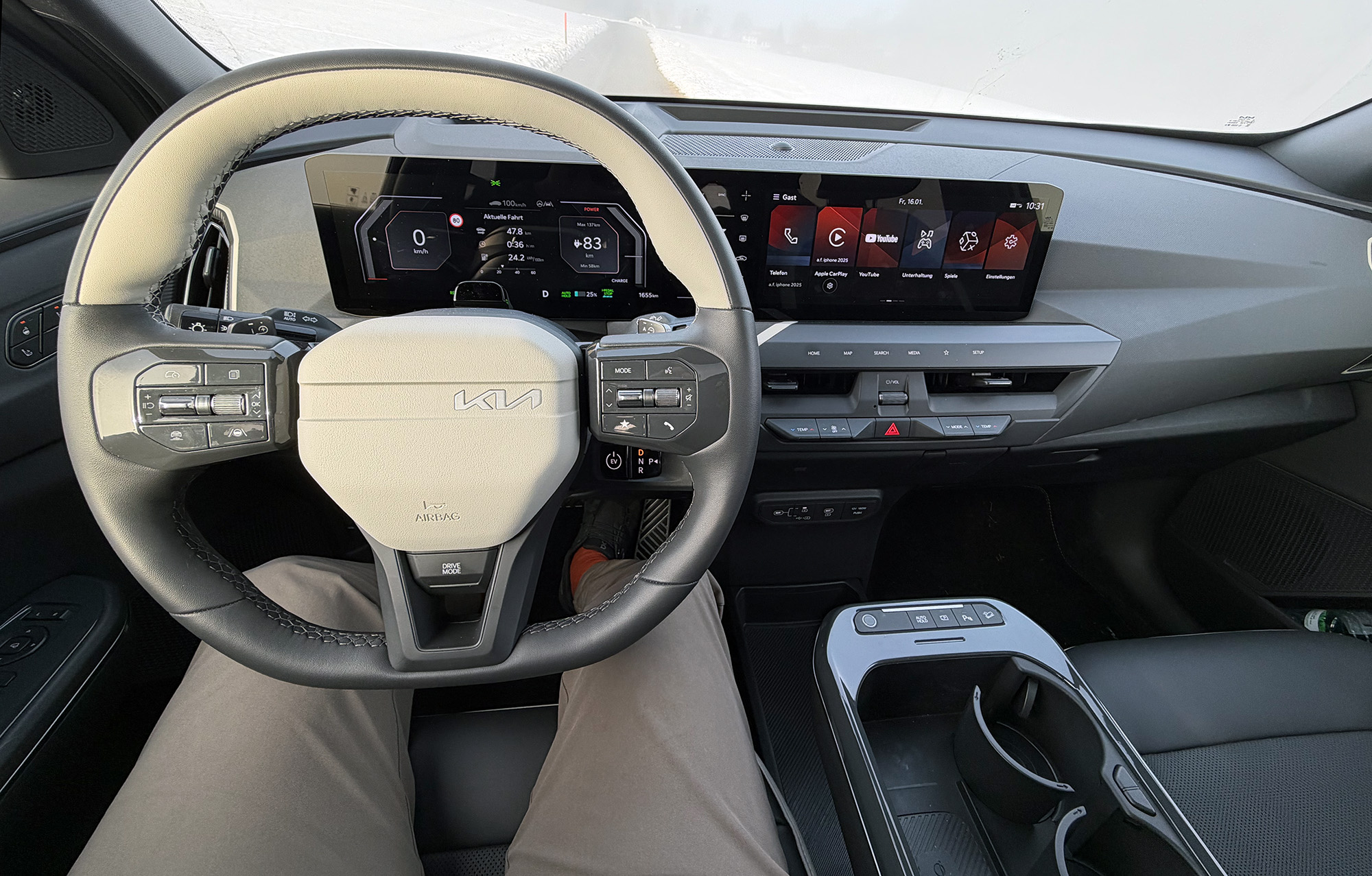 So sind hier auch die wegdrehbaren Cupholder oder der induktive Ladeplatz fürs Handy durchdacht. Dass man bei Kia und Hyundai das Kamerabild beim Blinken in den Tacho einblendet, ist mittlerweile nicht mehr neu, aber noch immer sehr hilfreich. Gerade bei kalten Temperaturen hilfreich: Die Möglichkeit, den Innenraum aus der Ferne via App vorzuwärmen. Das funktioniert über Kia Connect sehr intuitiv. Der elektronische Helfer meldet sich auch, um vom voll geladenen Akku zu berichten. Und damit man nicht mit offener Ladeklappe umherfährt, schliesst sich selbige von selbst.