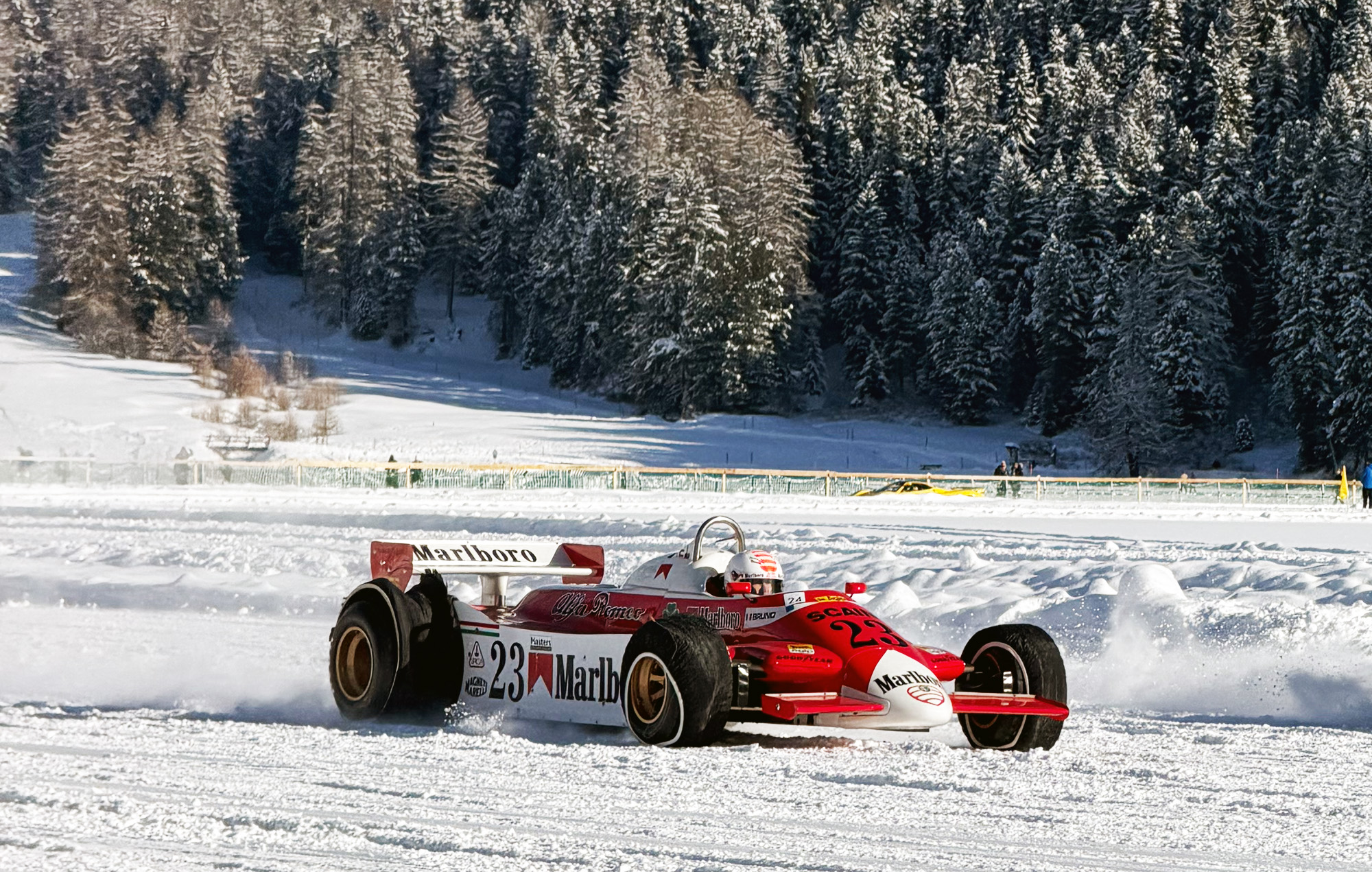 Wie lässt sich so ein LeMans-Renner noch toppen? Richtig, mit einem Formel 1 Auto. Der Alfa Romeo 179 trug für die Fahrt auf Schnee und Eis traktionsfördernde „Socken“ über seinen superbreiten Slickwalzen. Doch weil der inzwischen 83-jährige Arturo Merzario keine Rücksicht auf die etwas anderen Bedingungen nehmen wollte, flogen die Traktionshilfen in hohem Bogen auf die Strecke. Bekannt für seinen Cowboyhut war der Italiener in den 1970er-Jahren für Williams, Ferrari, Shadow, Wolf, Coppersucar und sein eigenes Team am Start der wichtigsten Rennserie der Welt. Der Alfa Romeo 179 verfügt über einen 60° V12, der 525 PS leistet. Er wurde 1980 von Bruno Giacomelli und Patrick Depailler bewegt.