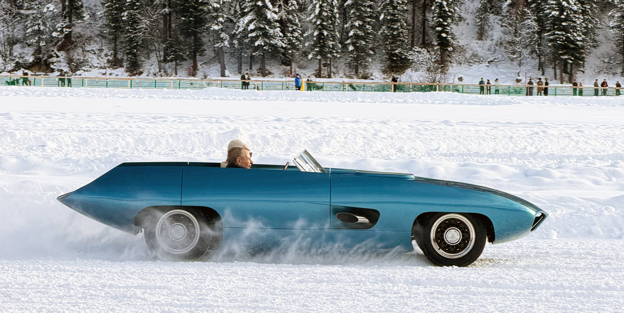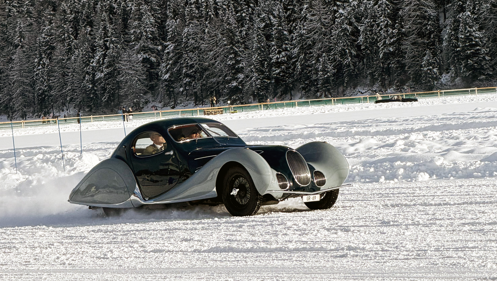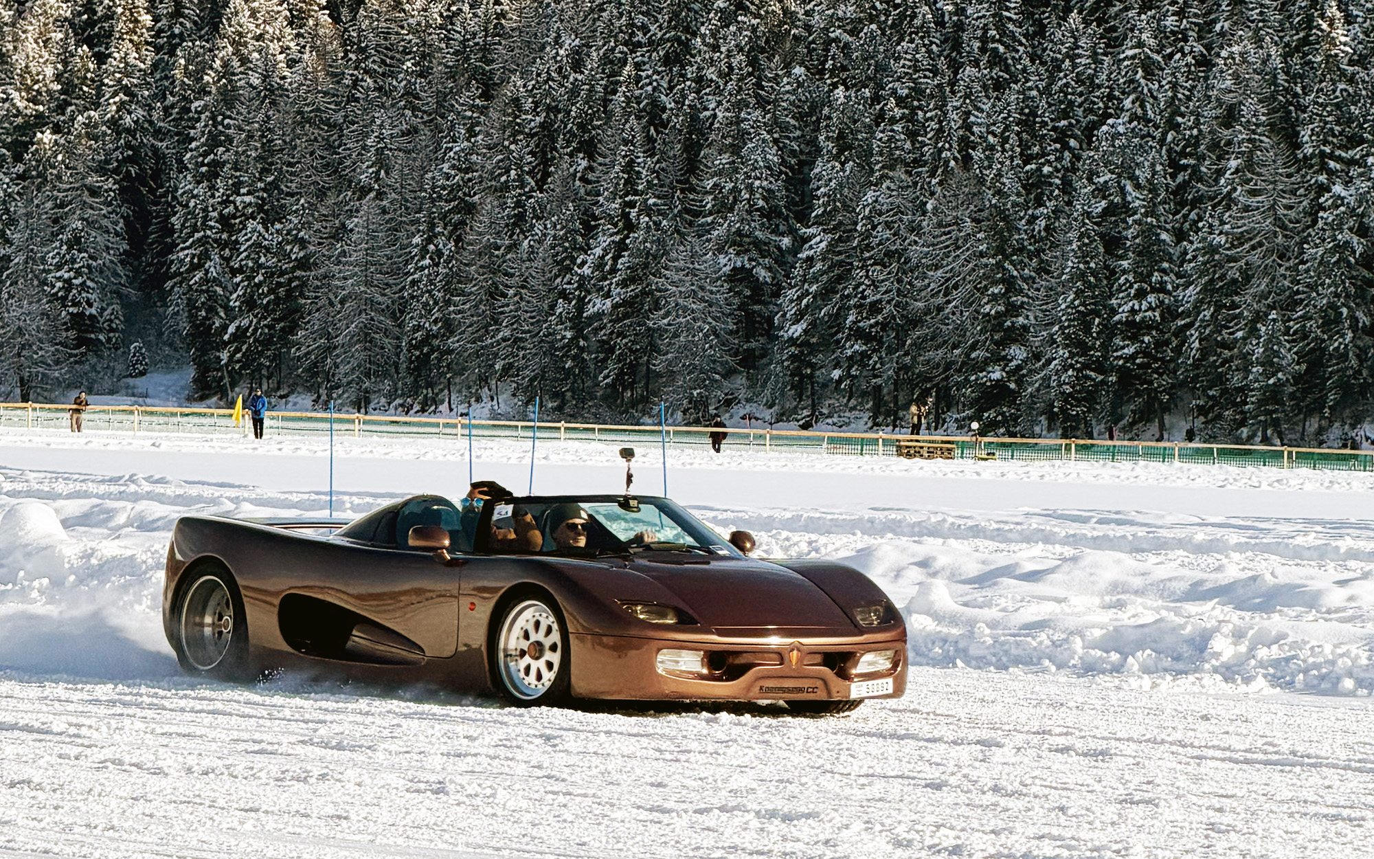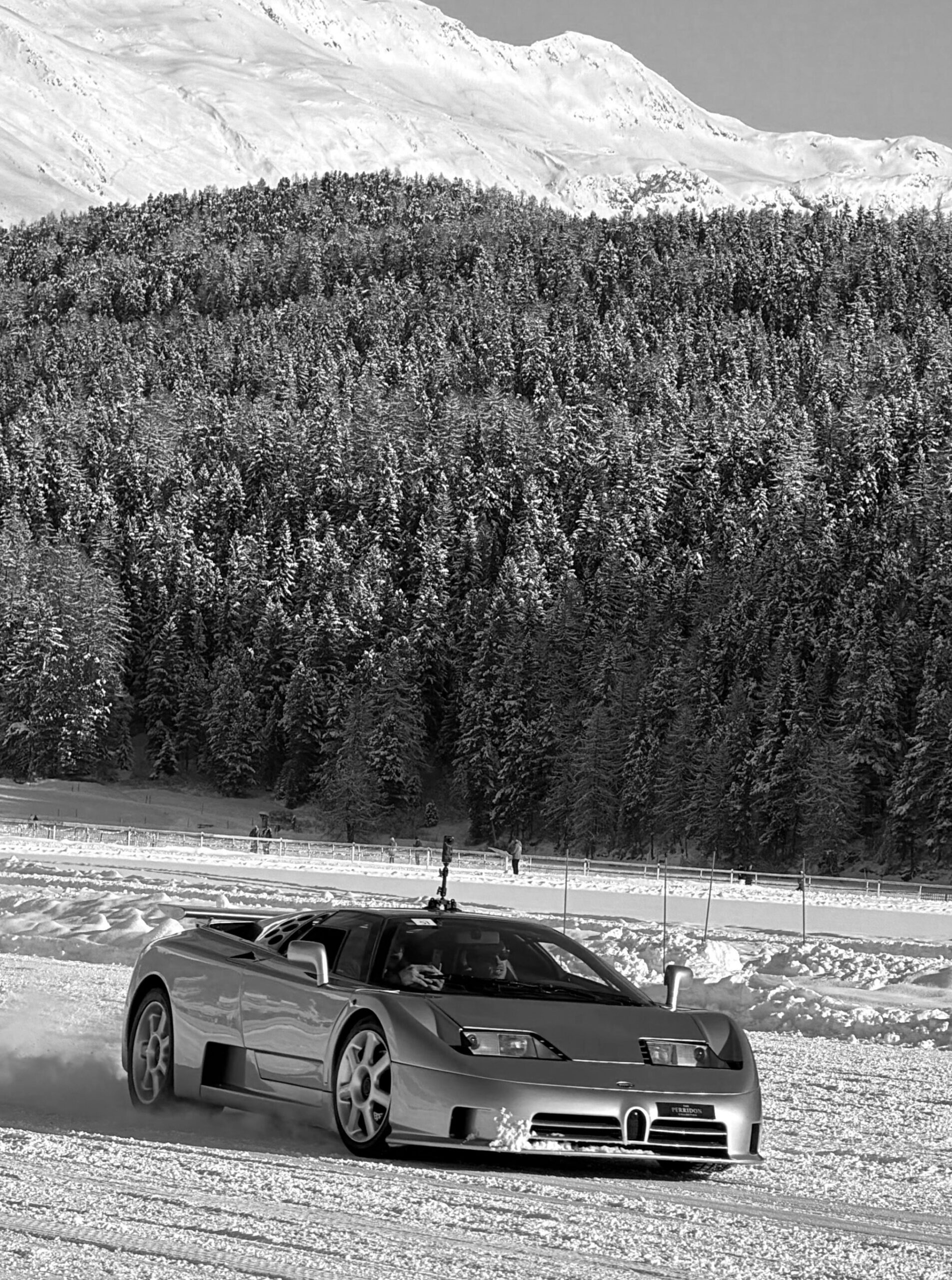 Nicht am Wettbewerb teilnehmend, konnte man den Rimac Nevera mit seinen 2000 Elektro-PS trotzdem auf der bald als Pferderennbahn genutzten Strecke bewundern. Kein geringerer als Bugatti- und Rimac-CEO himself, Mate Rimac, steuerte den Hypersportwagen völlig geräuschlos und mit viel Verve über das kalte Weiss.
