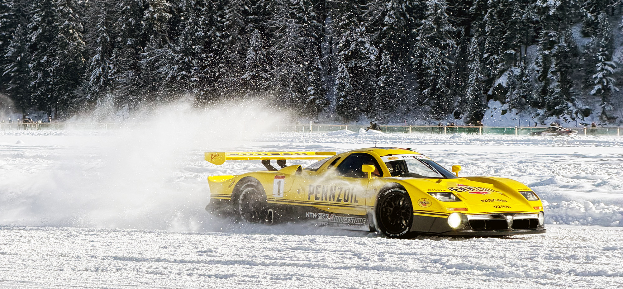 Ein LeMans-Sportwagen auf dem zugefrorenen See fahren zu sehen, ist an sich schon surreal genug. Wenn man aber liest, dass Erik Comas mit dem knallgelben Japaner auf öffentlichen Strassen angereist ist, wächst der Respekt für den Auftritt ins Uneremessliche. Der frühere Formel 1 Pilot (2 Jahre für Ligier, 2 Jahre für Larousse) hat für Nismo drei Mal bei Le Mans teilgenommen. Mit genau diesem Nissan R390 GT1. Der 3,5-Liter V8 bringt es mit zwei Turbos auf 560 PS. Von Nissan gab es nur ein einziges offiziellesvExemplar mit Strassenzulassung. Der R390 GT1 von Comas wurde dagegen nachträglich strassentauglich gemacht, wofür einige kleinere Änderungen vorgenommen werden mussten.